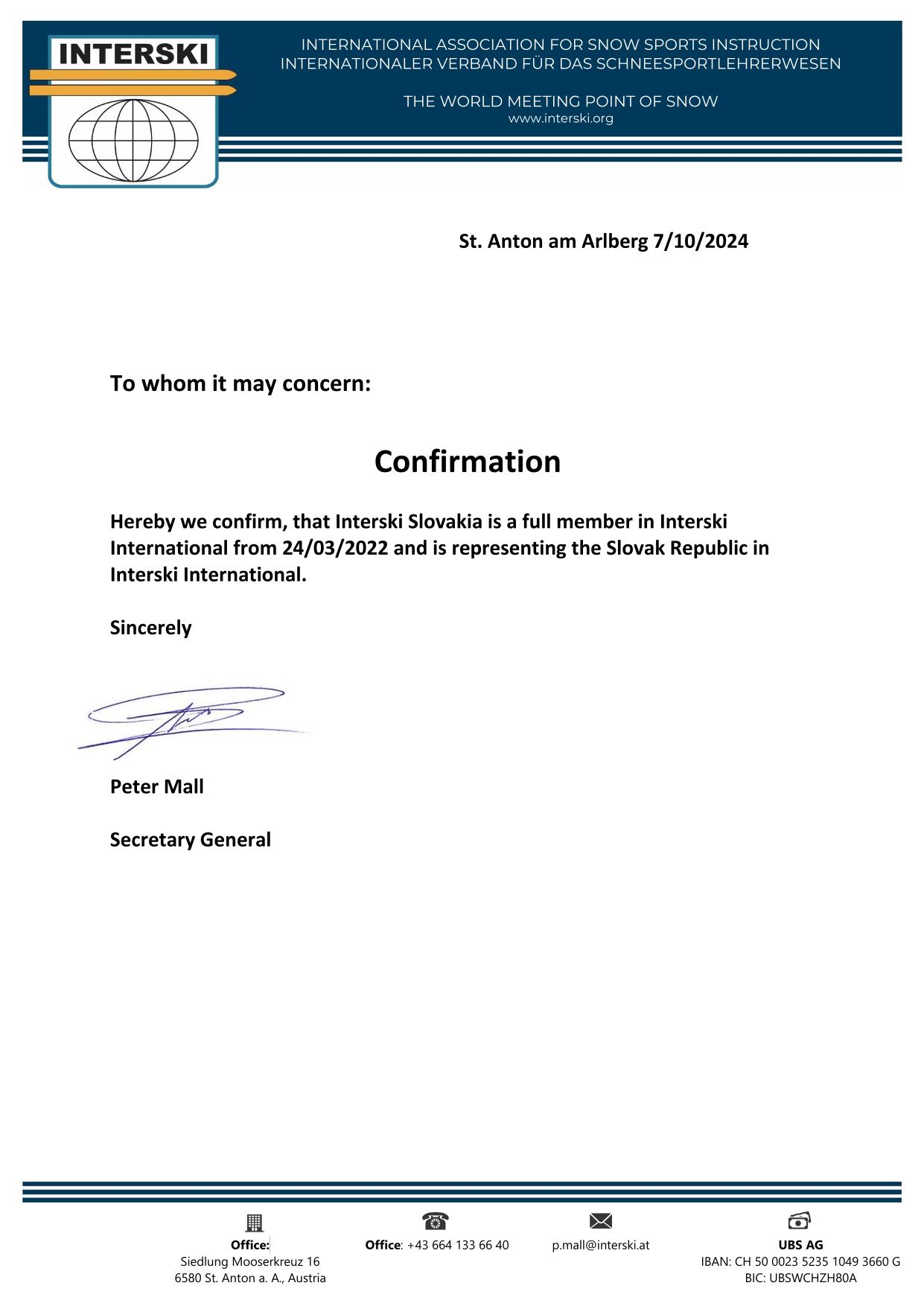 INTERSKI INTERNATIONAL www.interski.org so sídlom v.švajčiarskom meste Baar, najvyššia medzinárodná autorita, ktorá od svojho založenia v.roku 1951 významne prispieva k rozvoju a.zlepšovaniu lyžovania, snowboardingu a snežných športov na.celom svete.